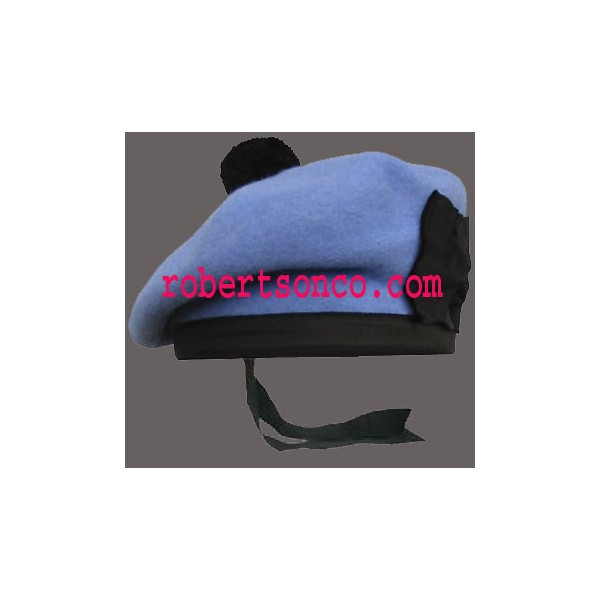 Sky blue 100% wool body, Single piece body construction, Black silk lining and trim Black silk 1 1/4 inch x 11 inch tail ribbons, Black silk badge backing rosette, Hand made 100% wool pom pom.