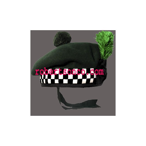 Dark Green 100% wool body, Single piece body construction, White / green wool dicing, Black silk lining and trim, Black silk 1 1/4 inch x 11 inch tail ribbons, Black silk badge backing rosette, Hand made 100% wool pom pom.