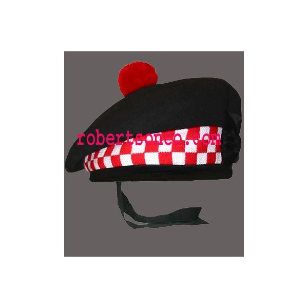 Black 100% wool body, Single piece body construction White / Red wool dicing Black silk lining and trim, Black, silk 1 1/4 inch x 11 inch tail ribbons, Black silk badge backing rosette, Hand made 100% wool pom pom.