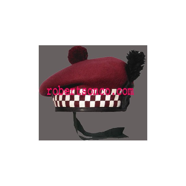 Maroon 100% wool body, Single piece body construction White / maroon wool dicing, Black silk lining and trim, Black silk 1 1/4 inch x 11 inch tail ribbons, Black silk badge backing rosette, Hand made 100% wool pom-pom, Shipping included in price.