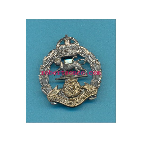 ROYAL HAMPSHIRE QUEENS CROWN.BI-METAL ARMY CAP BADGE.GOOD CONDITION.SIZE 4.5 x 5cms.., available in nickle plated and gold colors...