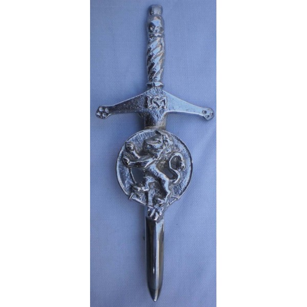 Piper and drummer kilt pin made in brass nickel plated with black watch crest on kilt pin. We can also make any kilt pin design or style on customer demand.