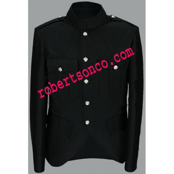 Black Cotton Cutaway Kilt Tunic unlined 4 pockets on front with thistle nickle palted buttons.