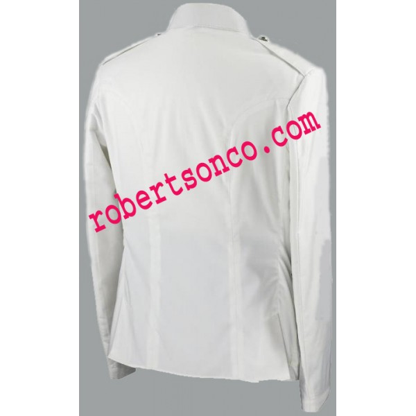 White Cotton Cutaway Kilt Tunic unlined 4 pockets on front with thistle nickle palted buttons.