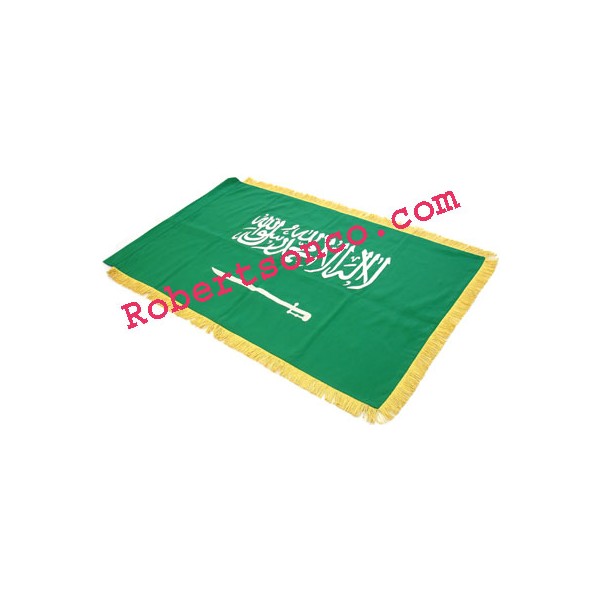 Kingdom of Saudi Arabia/Al Arabiyah as Suudiyah. The embroidery on this flag is hand made in 2wm gold wire and 90% silver. It is therefore suitable for indoor ceremonial use only.