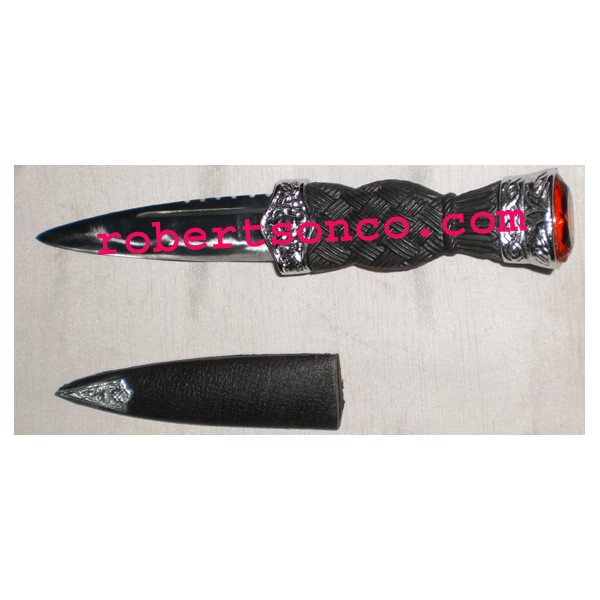 Skean dhu or Sgian dubh made in all of black plastic nickel plated steel plain blade and nickel plated thistle mounts different color stone on the top of plastic handle.