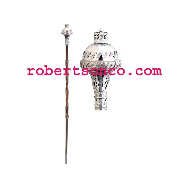 Drum Major's ceremonial mace mallaca cane bright silver chrome plated chain andbright silver chrome plated ferrules with bright silver chrome plated trumpet shap head on leaves and crown on the top of mace use for pipe band's drum majors.