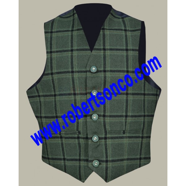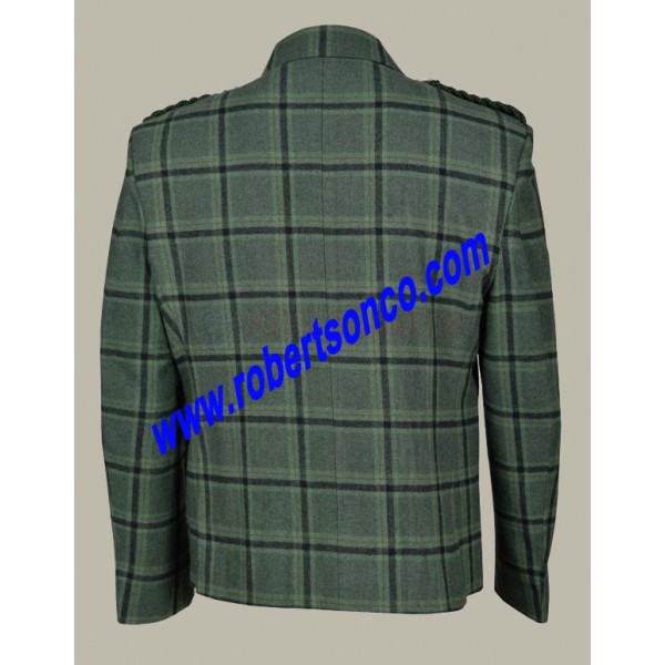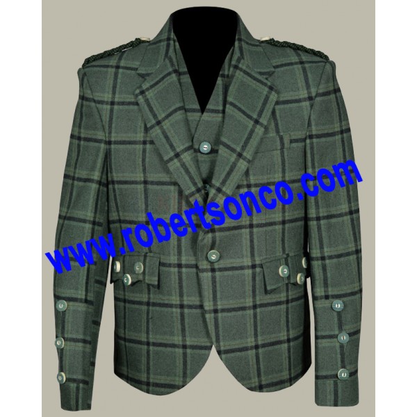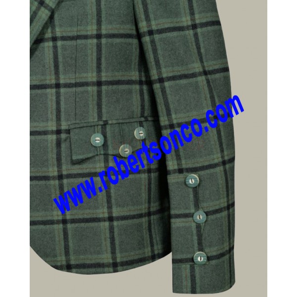 Traditional Check Style Lovat Green Tweed Argyll Kilt Jacket with Five Button Waistcoat.
