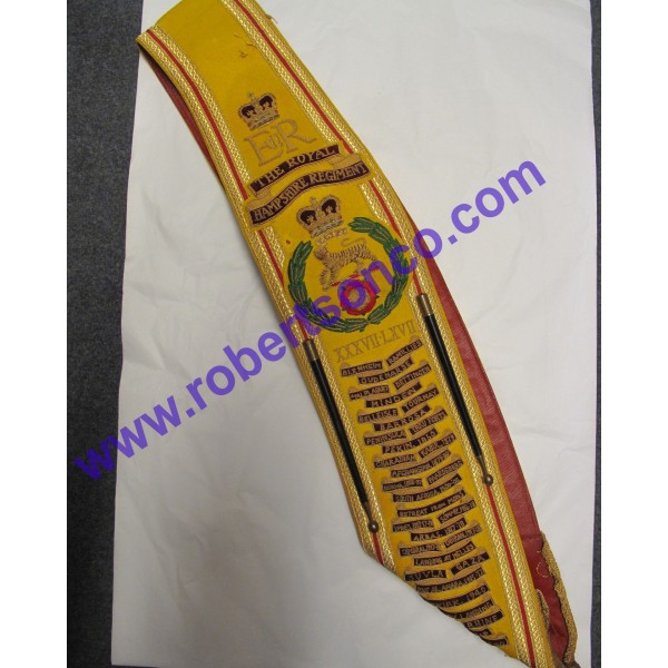 Royal Hampshire Regiment Drum Majors Sashon Yellow Fabric and Red PVC backing.... Fully Hand Embroidery bullion wire use, red fabric scrolls backing with double side gold briad and red trim in middle. Black color wood drum sash sticks with gold plated ferrlues.