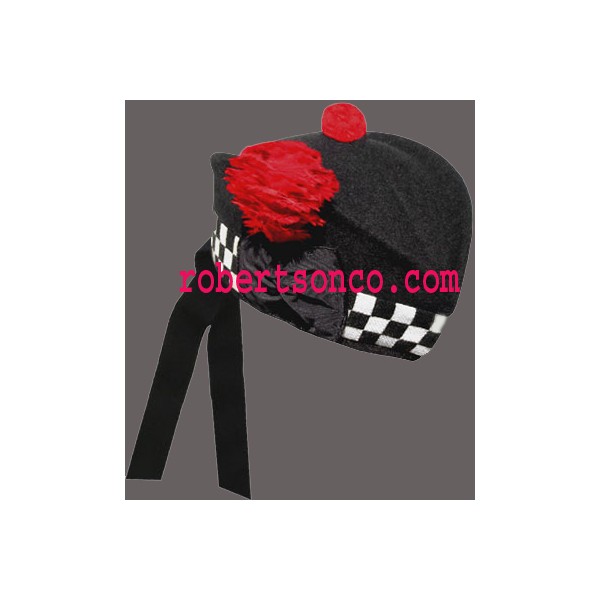 Black 100% wool body Single piece body construction, White / Black hand knit 100% wool dicing band, Black silk lining and trim Black silk 1 1/4 inch x 11 inch tail ribbons, Black silk badge backing rosette Red Hand made 100% wool toorie.