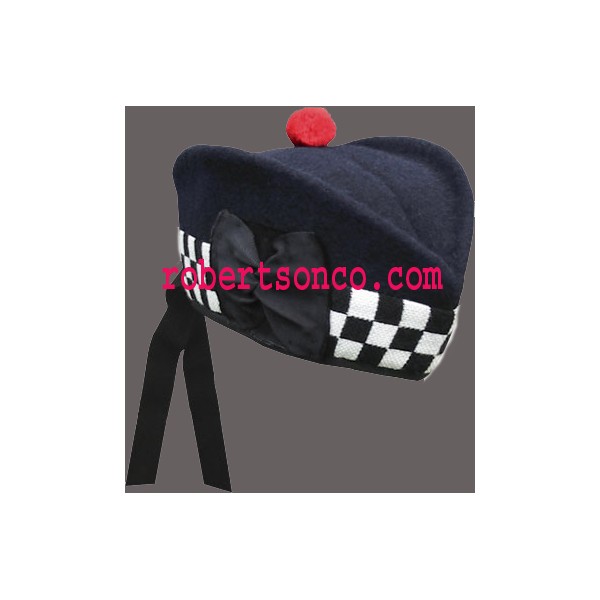 Navy 100% wool body , Single piece body construction , White / Black 100% wool dicing band , Black silk lining and trim , Black silk 1 1/4 inch x 11 inch tail ribbons Black silk badge backing rosette , Red Hand made 100% wool toorie.