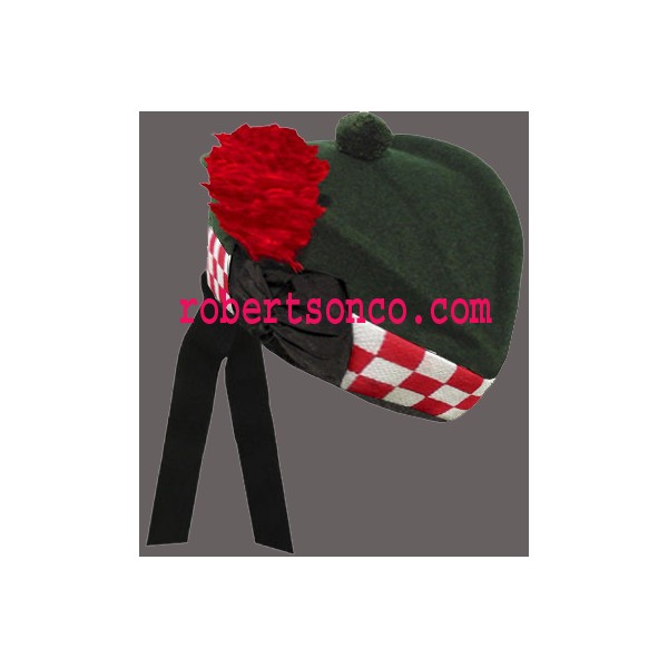 Dark Green 100% wool body , Single piece body construction , White / Red hand knit 100% wool dicing band , Black silk lining and trim , Black silk 1 1/4 inch x 11 inch tail ribbons , Black silk badge backing rosette , Dark Green Hand made 100% wool toorie.