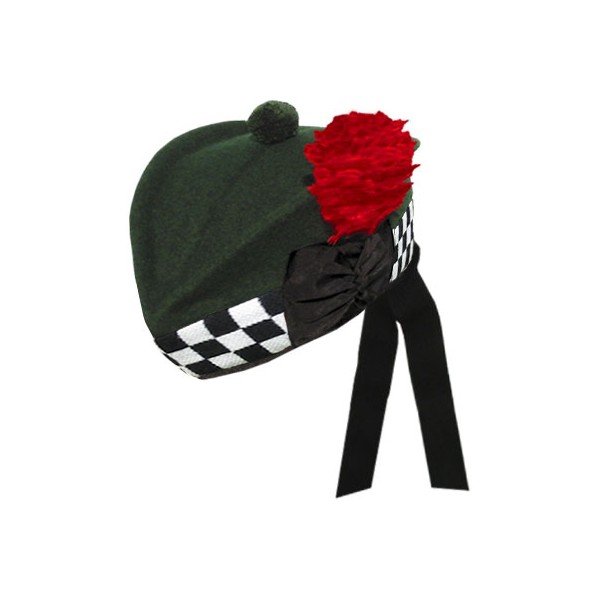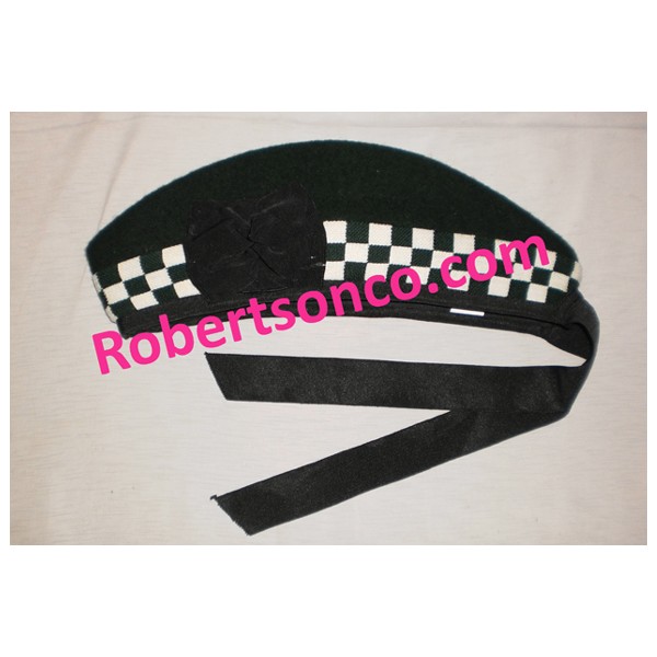 Dark Green 100% wool body , Single piece body construction , White / Green hand knit 100% wool dicing band , Black silk lining and trim , Black silk 1 1/4 inch x 11 inch tail ribbons , Black silk badge backing rosette , Dark Green Hand made 100% wool toorie.