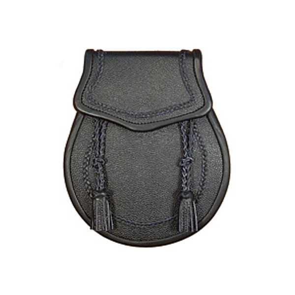 Black plain leather sporran made in 100% pure leather two leather rope style and leather tassels with black button include leather strap with nickel plated hardware buckle use for pipe band's pipers and drummers.
