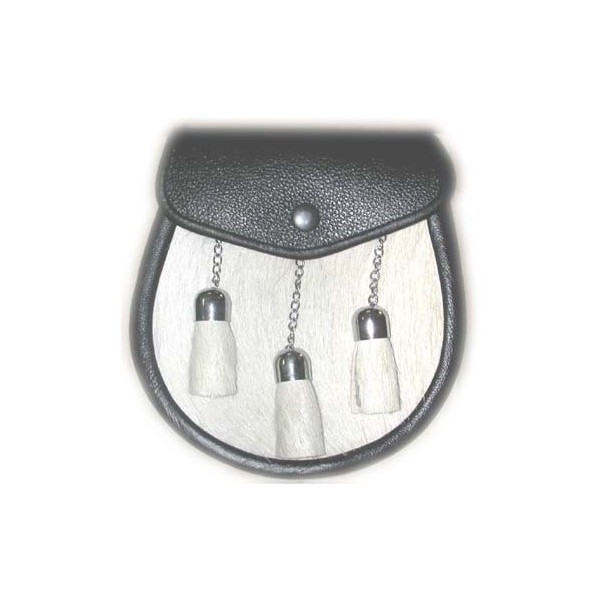 Semi dress sporran made in pure leather white fur on the front nickel plated chain and fur tassals with black button...