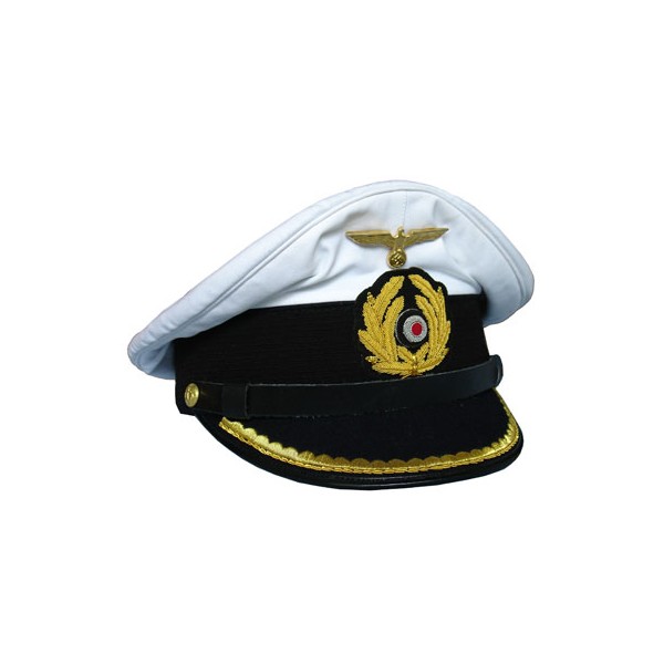 U-boat visor cap for Leutnant (Kapitanleutnant), complete with Fine hand embroider bullion wreath and insignia. It has the mohair band and white cotton top with leather chinstrap.