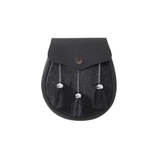 Semi dress sporran made in pure leather black fur on the front nickel plated chain and fur tassals with black button...