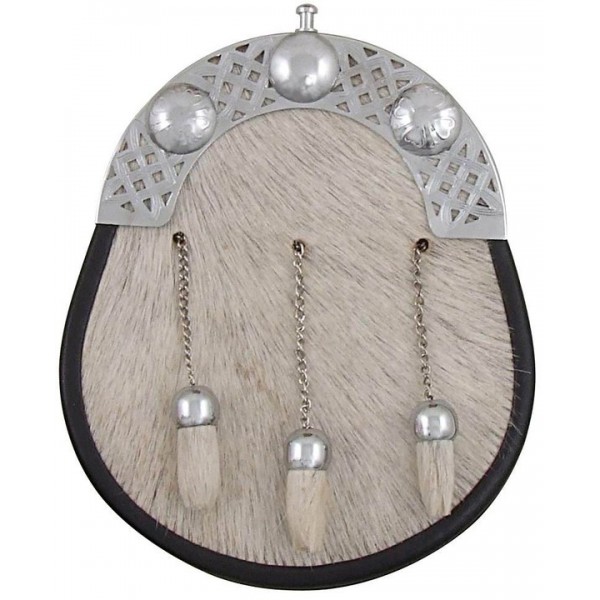 Semi dress sporran made in pure leather goat fur on the front nickel plated chain and fur tassals with nickel plated cantle...