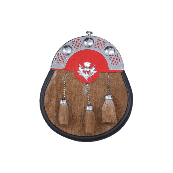 Semi dress sporran made in 100% pure leather fur on the front nickel plated chain and fur tassals with nickel plated cantle and and nickel plated thistle badge include leather belt strap with nickel plated hardware buckle use for pipe band's pipers and drummers.