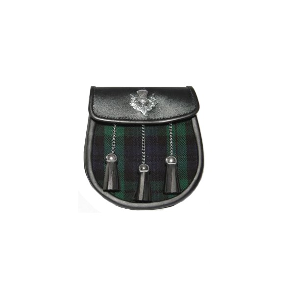 Semi dress sporran made in 100% pure leather Blackwatch tartan on the front nickel plated chain and leather tassals with nickel plated thistle badge include leather belt strap with nickel plated hardware buckle use for pipe band's pipers and drummers.