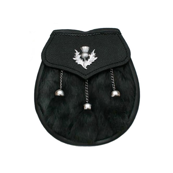 Semi dress sporran made in pure leather black fur on the front nickel plated chain and fur tassals with nickel plated thistle badge...