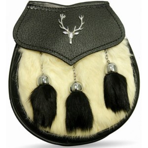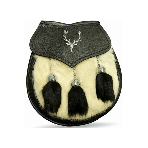 Semi dress sporran made in pure leather white fur on the front nickel plated chain and fur tassals with nickel plated barasingha badge...