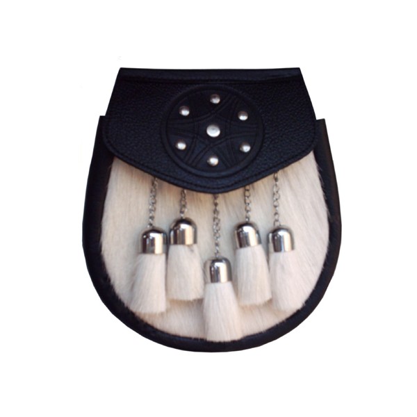 Semi dress sporran made in pure leather white fur on the front nickel plated chain and fur tassals with nickel plated nail...