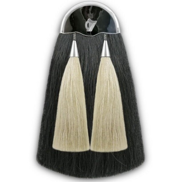 Military long horse hair sporran made in pure leather, Original black long horse hair on the front two white long horse hair tassals with back pocket nickel plated light cantle and nickel plated harp badge...