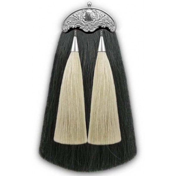 Pipe Band long horse hair sporran made in 100% pure leather Original black long horse hair on the front two white long horse hair tassals with back pocket and nickel plated cantle include nickel plated chain belt leather strap with nickel plated hardware buckle use for pipe band's pipers or drummers or military cadets or military security guard.