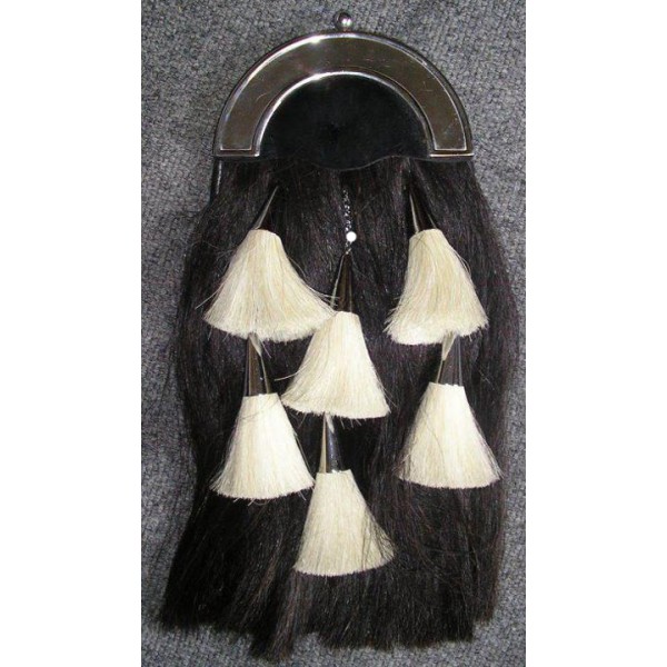 Military long horse hair sporran made in pure leather, Original black long horse hair on the front six white small horse hair tassals with back pocket and nickel plated cantle...