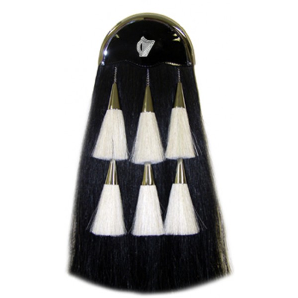 Military long horse hair sporran made in 100% pure leather, Original black long horse hair on the front six white small horse hair tassals with back pocket and nickel plated light cantle and nickel plated harp badge include nickel plated chain belt leather strap with nickel plated hardware buckle use for pipe band's pipers or drummers or military cadets or military security guard.