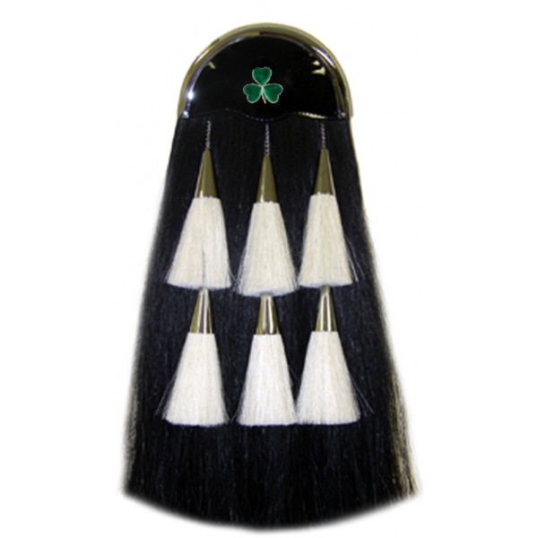 Military long horse hair sporran made in pure leather, Original black long horse hair on the front six white small horse hair tassals with back pocket and nickel plated light cantle and nickel plated irish maple leaf badge...