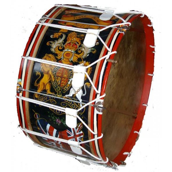 Pipe band bass drum size 30" x 12" with wooden hoops and wooden shall also rope and brace fitting include logo.