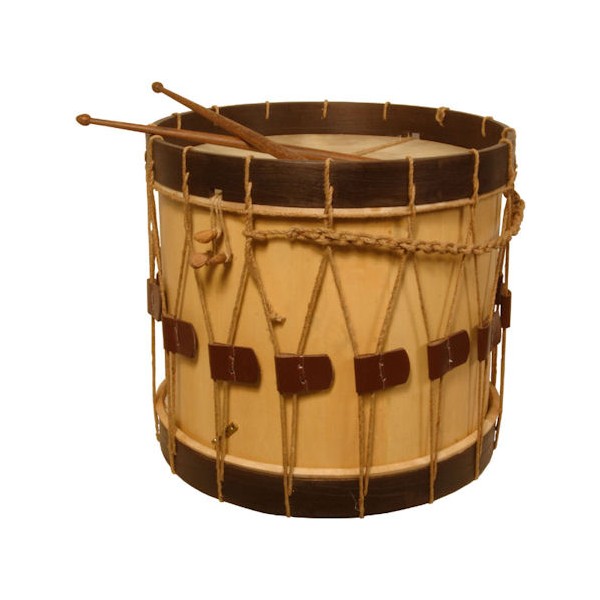 Renaissance Drum, 18" x 13" wooden shall and wooden hoops rope and brace fitting with beaters.