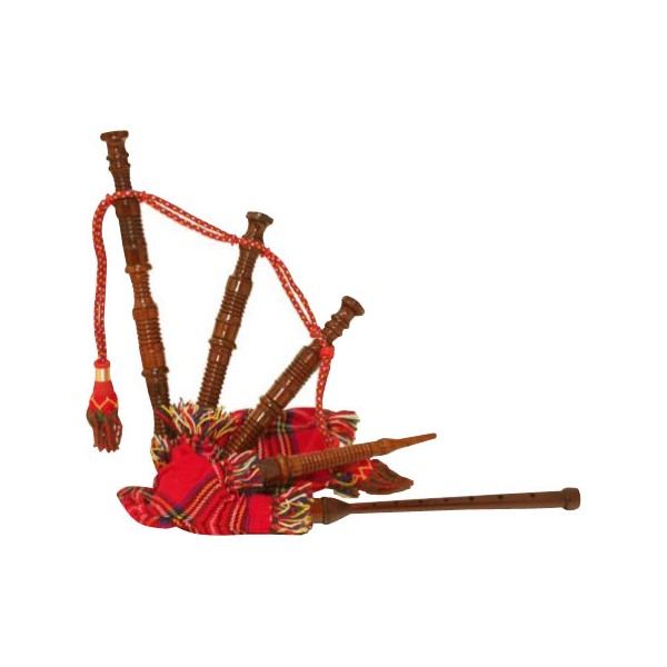 Toy Bagpipe sheesham wood fine brown finishing, funcational pipe chanter with ivory plastic sole include plastic bag, Royal Stewart tartan cover, Royal Stewant wool cord and white plastic reed.