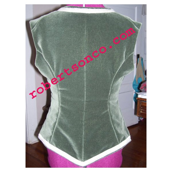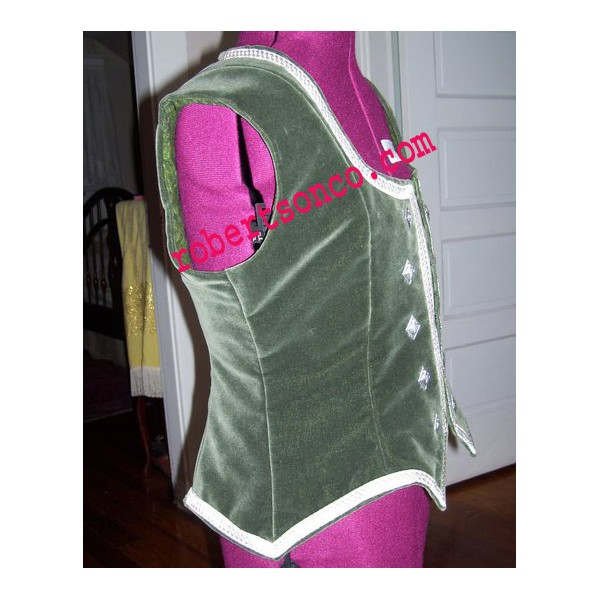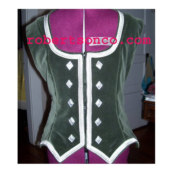 Green Ladies Highland Dance Jacket Cotton Velvet Vest. White Satin Lining. Hook and eye front closure. 10 Gold or Silver removable diamond thistle buttons affixed with washers and ring clips. Gold or Silver 1/2" braid edge trim.