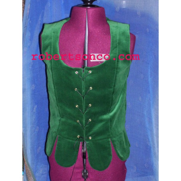 Green Emerald Aboyne Ladies Highland Dance Jacket Cotton Velvet Vest. White Satin Lining. Hook and eye front closure. 10 Gold or Silver removable diamond thistle buttons affixed with washers and ring clips. Gold or Silver 1/2" braid edge trim.