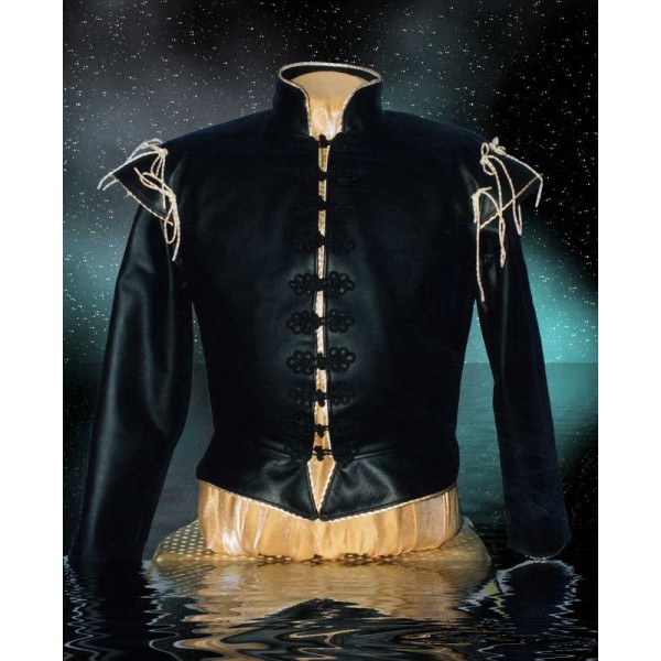 Smooth black leather, Identical features of our wool doublets, Black leather body, Black Trims, Black nylon / silk blend full lining, 2 inch standup collar, Removable 5 bar shoulder shells included.