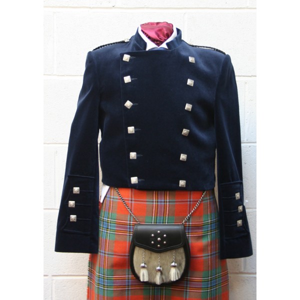 The Kinloch Anderson Montrose Doublet is a double breasted short cut evening jacket with high collar. There are ten symmetrically positioned thistle buttons on front, three thistle buttons on each cuff and epaulettes with thistle buttons on each shoulderPlease note that due to the need for very precise measurement, we can supply this garment only after measurements.