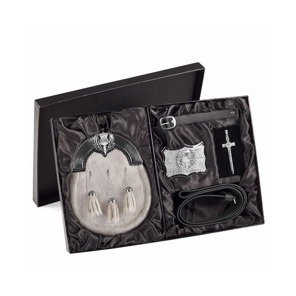 White Rabbits Hair Sporran with thistle badge on cantle, Adjustable leather and Velcro belt, Sporran chain, chrome thistle badge on buckle, Chrome finish kilt pin.