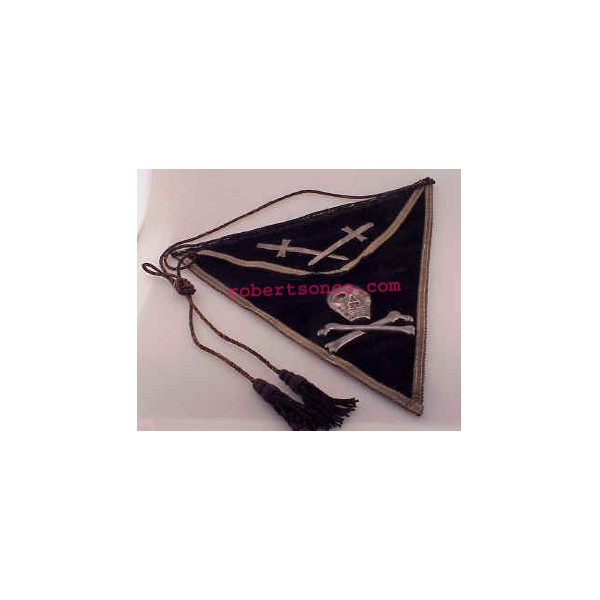 This Masonic apron of black velvet with silver edging & silver mountings copy was made by Robertson & Company, Chicopee, Mass. It is unusual to find the skull and cross bones emblems. It is in excellent to near new condition but one cross bone rear retainer has come apart that needs soldering. You probably won't see another of these for sale.