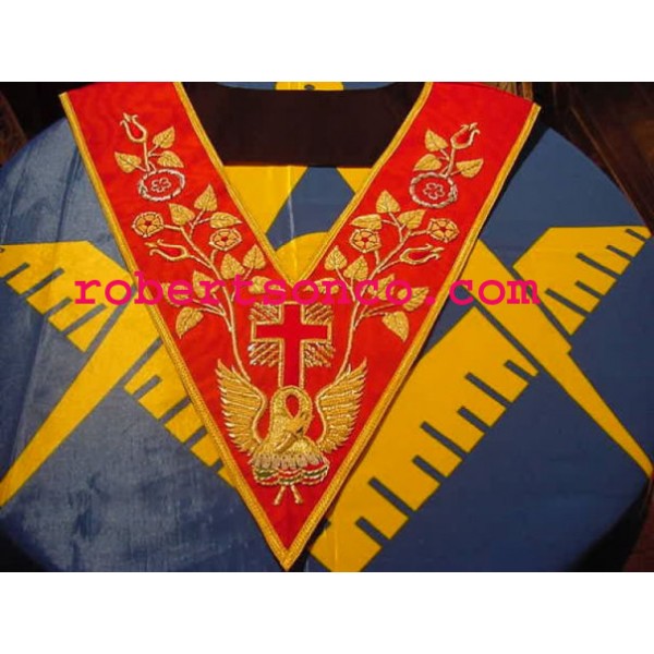 18th degree AASR necklace richly hand embroidered with gold son, big money on silk embossed with pink pelican, Latin cross, Oroboros, piece exeptional in the spirit of old decor black back with red Latin cross. We use finest material.